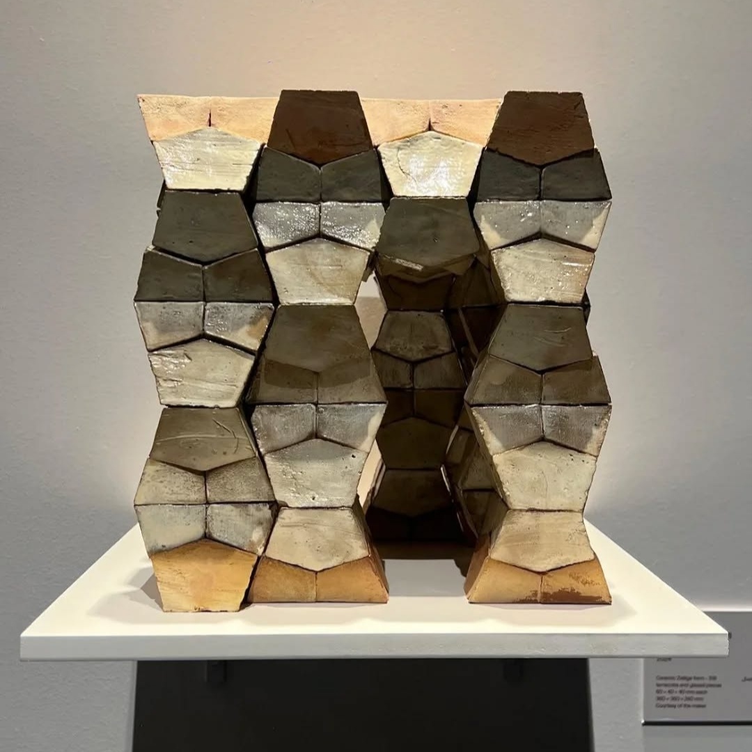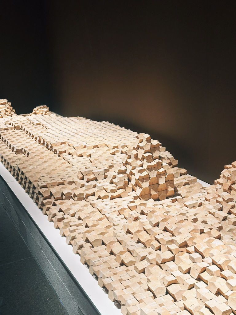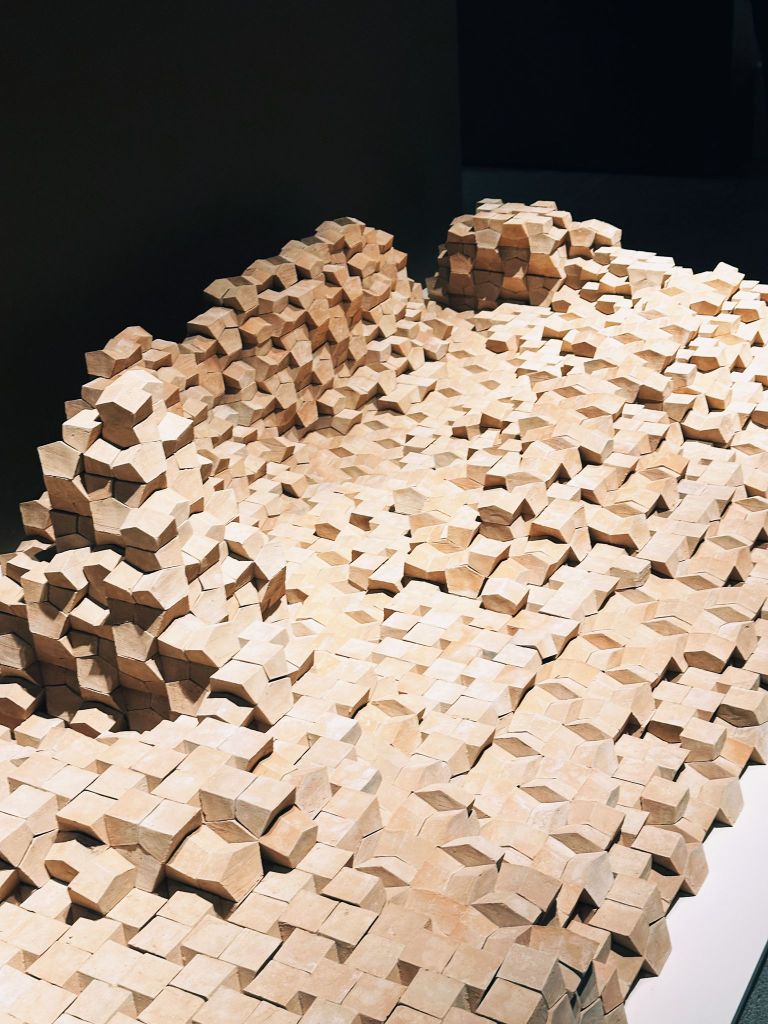 The main artwork is composed of approximately 20,000 identical pieces of 6x4x4cm in terracotta, which, thanks to their rotation in space, fit together to form an organic geometric body, which reminds us of the way in which crystallizations are produced in nature.