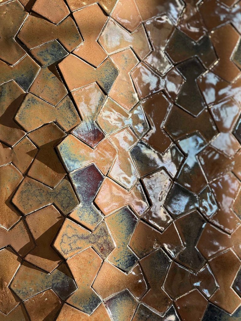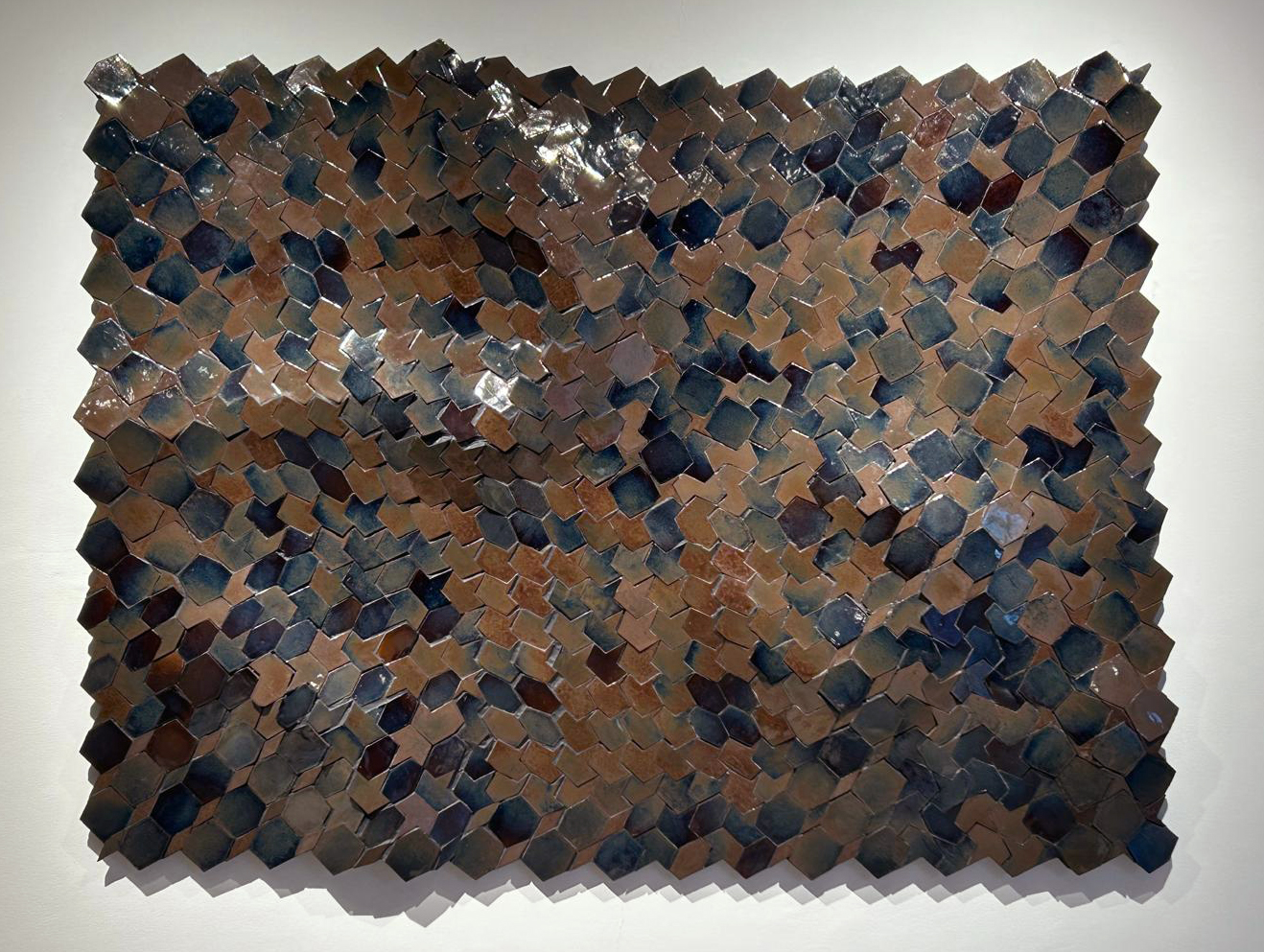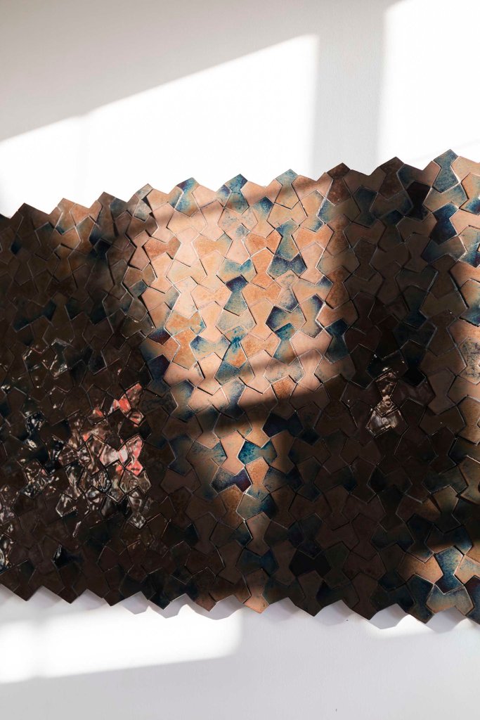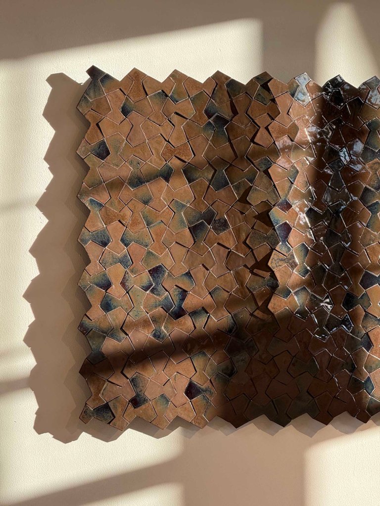Disturbance is a series of eight geometries that utilizes the zellige technique of Tetouan (crafted with Tefaline clay from Tetouan) assembled with resin and fiberglass. Although the geometry appears regular, the work explores a series of subtle alterations.