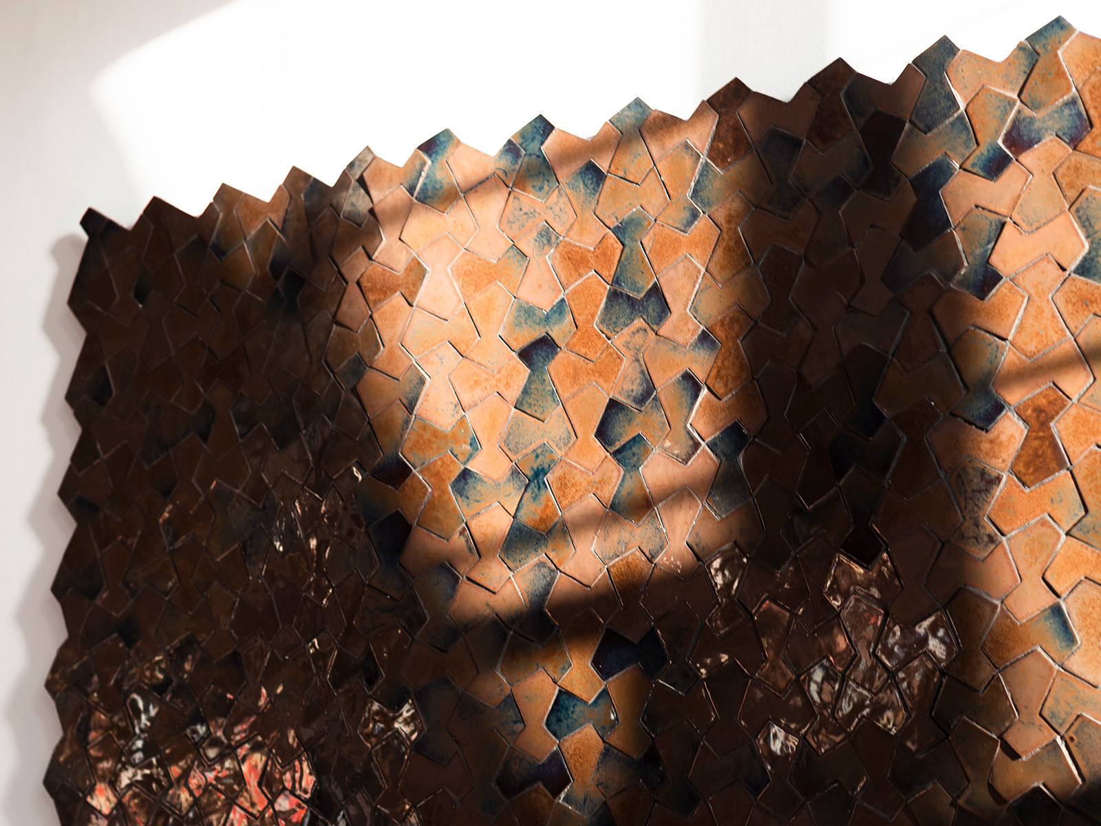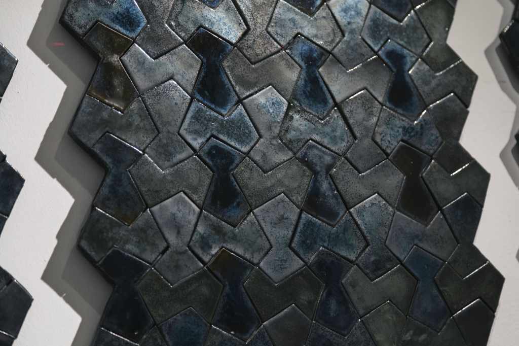 Disturbance is a series of eight geometries that utilizes the zellige technique of Tetouan (crafted with Tefaline clay from Tetouan) assembled with resin and fiberglass. Although the geometry appears regular, the work explores a series of subtle alterations.