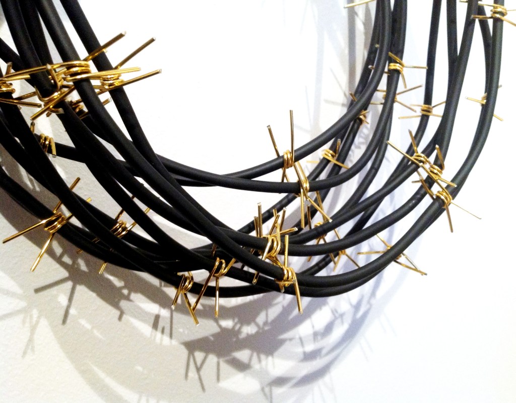 The brass pieces simulate the coils used for the electrical cables that traverse our planet; the brass itself alludes to currency and, therefore, to capitalism. The cables transform from barbed wire into mosaics that connect the brass coils. In this work, as in many previous ones, I turn to mosaics inspired by Islamic art, referring to the current complexity of the image that mass media can create of an omnipresent global enemy. Here, the geometry of frequencies acts as a unifying element, combining them with the spikes that represent elements of separation.