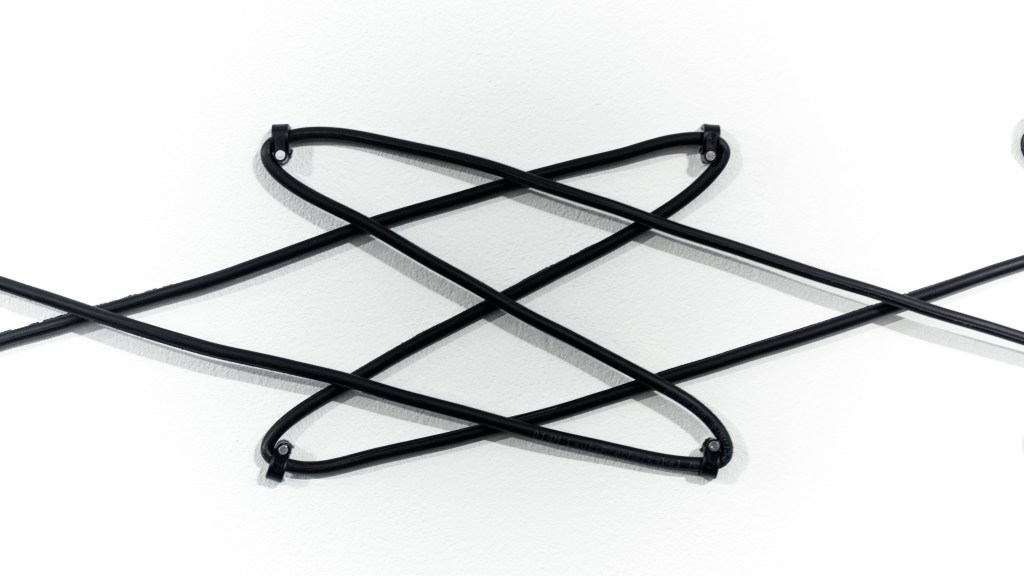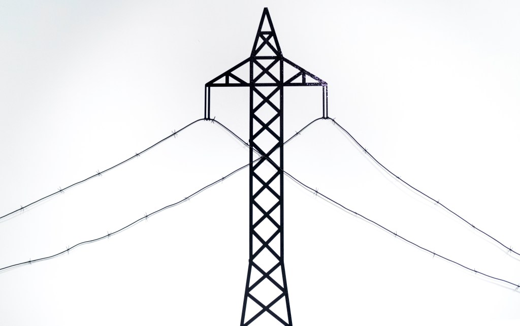 From a distance, we perceive utility poles and brass coils connected by cables. As we move closer, we realize that these cables contain spikes simulating barbed wire, turning this connection into something unsettling.