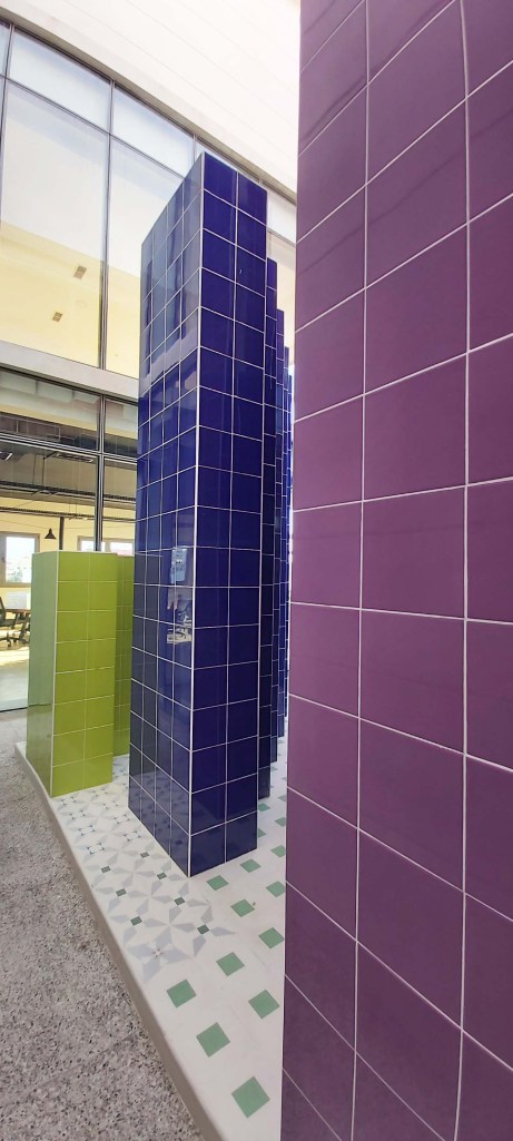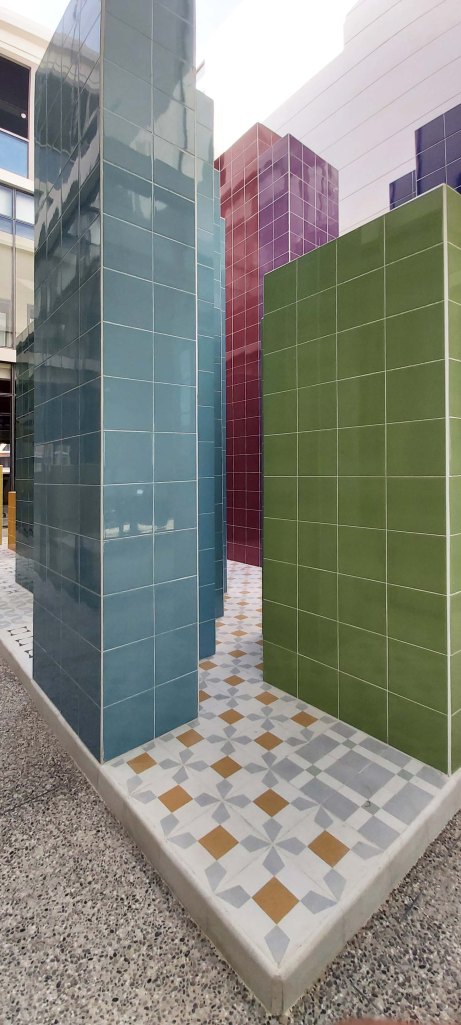 On the floor the 12 musical notes are represented as cement tiles using the MUSAIC language created to transform musical notes into geometric tiles.