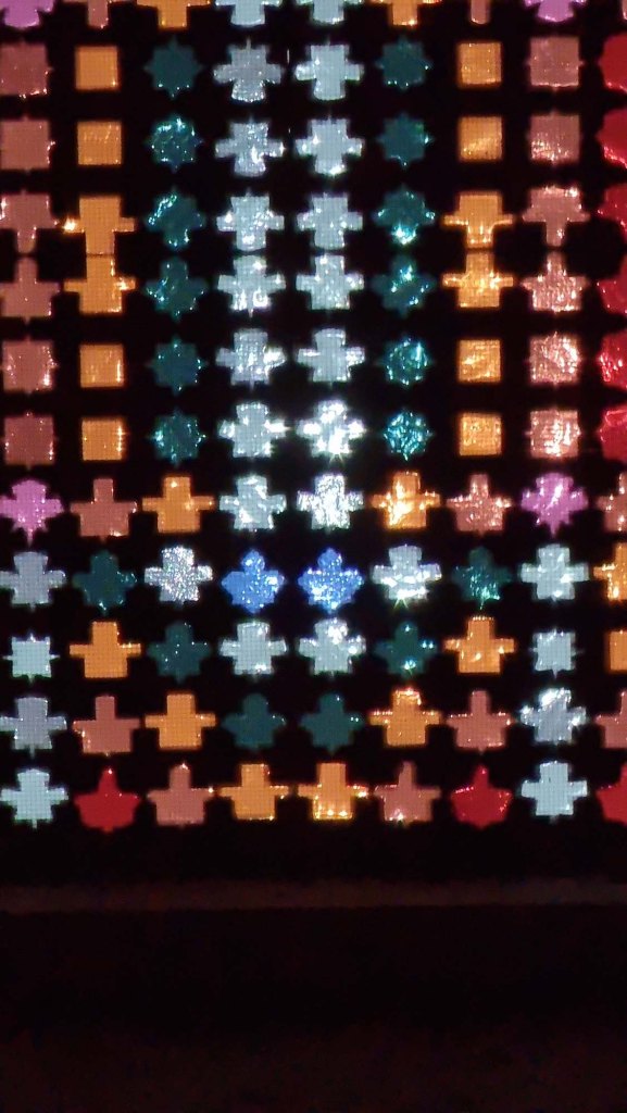 The work is made with the traditional Zellige of Tetouan. These white ceramic tiles are inlaid in cement panels with a metal structure and on which the colors of each note are projected. This interactive projection is sensitive to sound and is altered by any sound interaction.