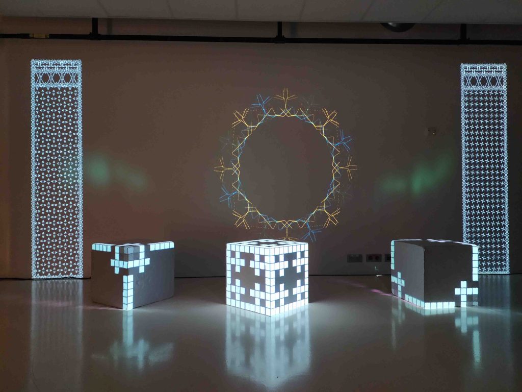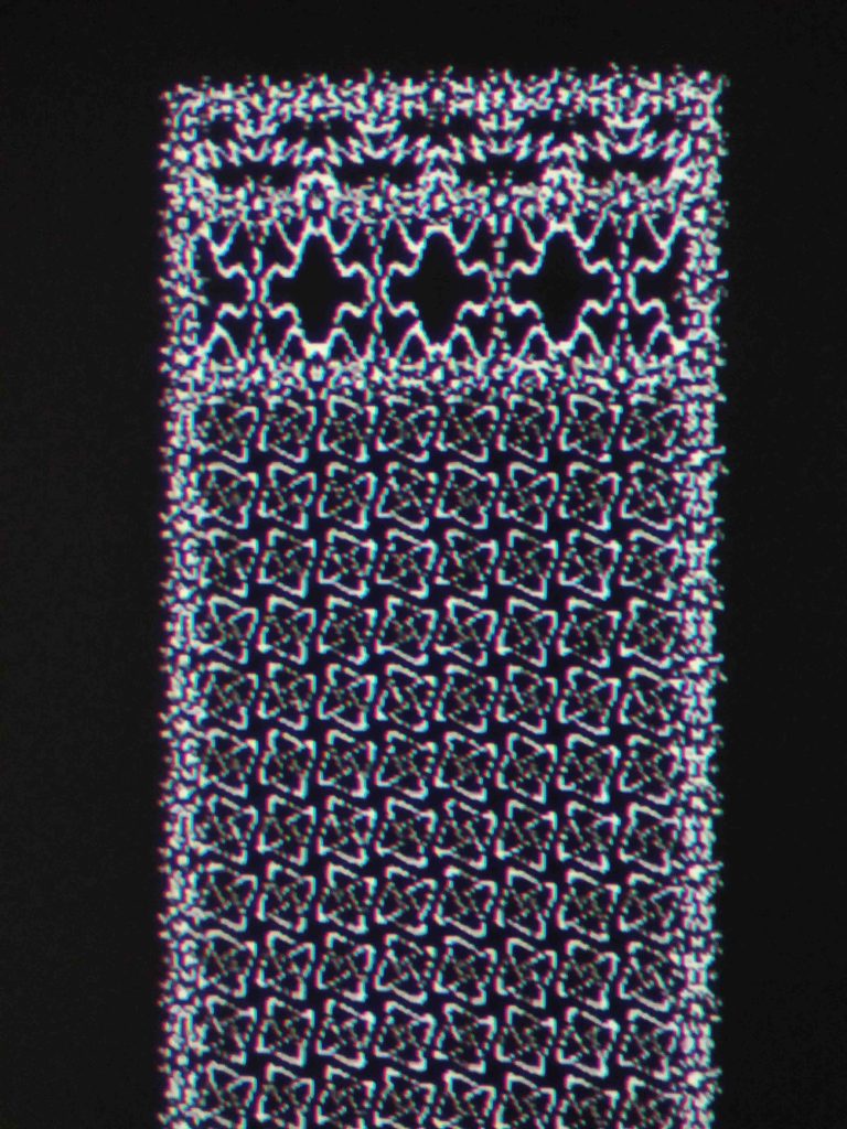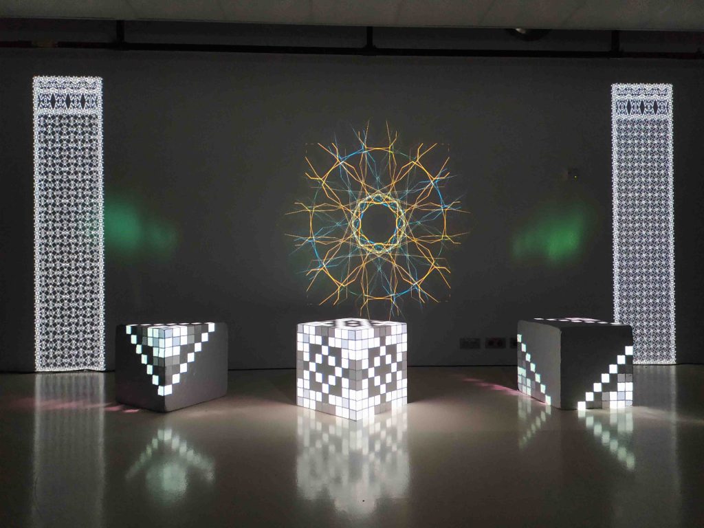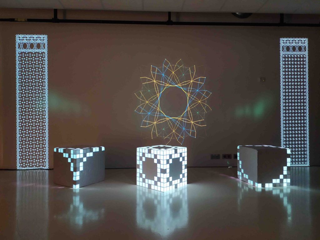 This installation aims to make visible the movement of frequencies by translating the sound into geometric mosaics. This interactive video mapping installation where connected to Sterolux stage mixing box while some groups were rehearsing generating an infinite number of symetric compositions.