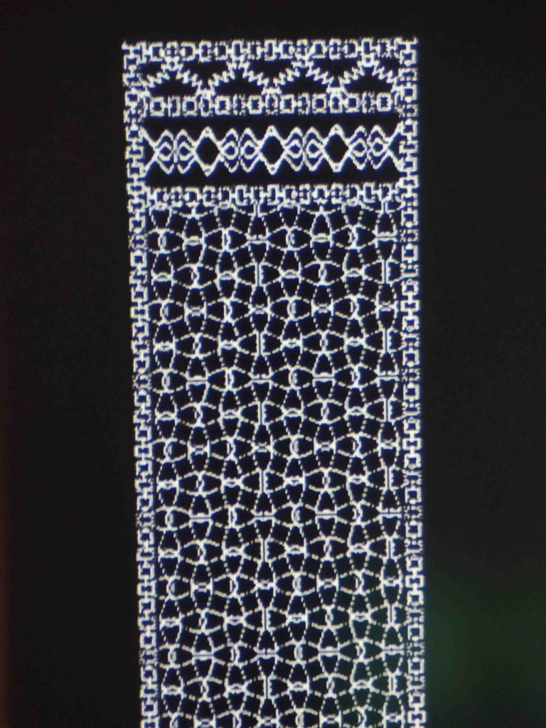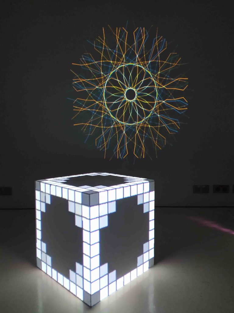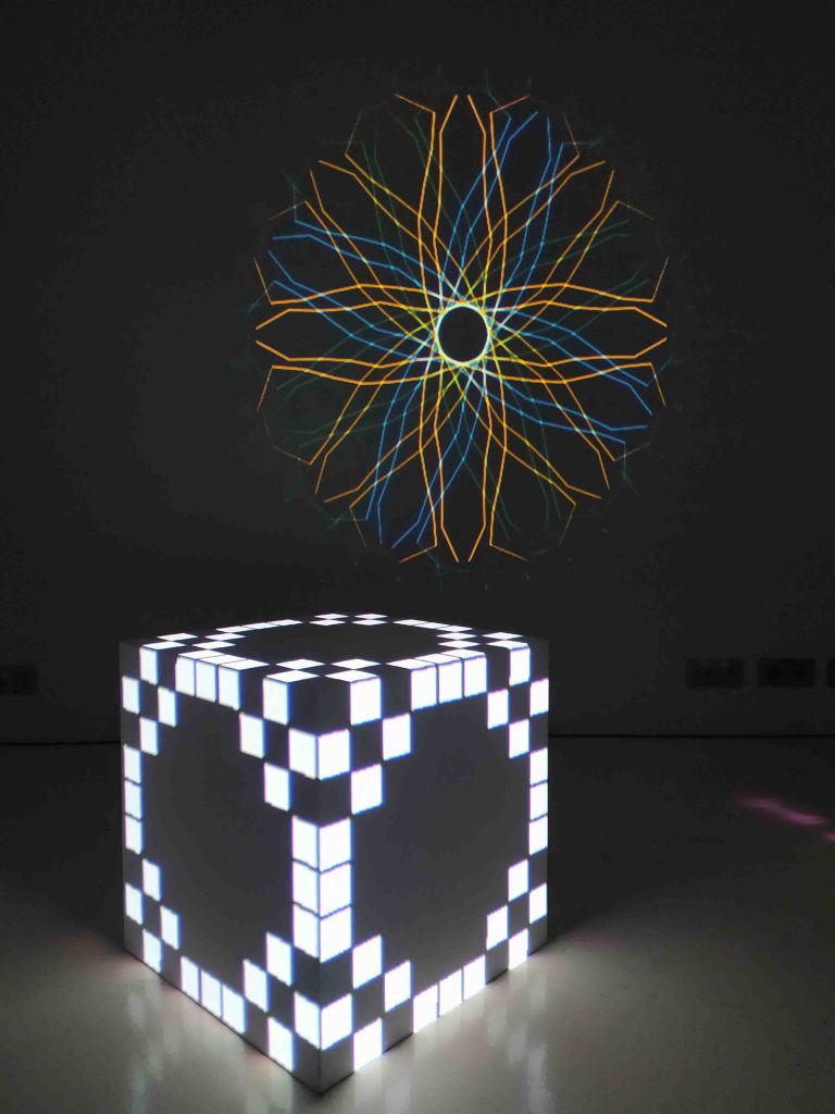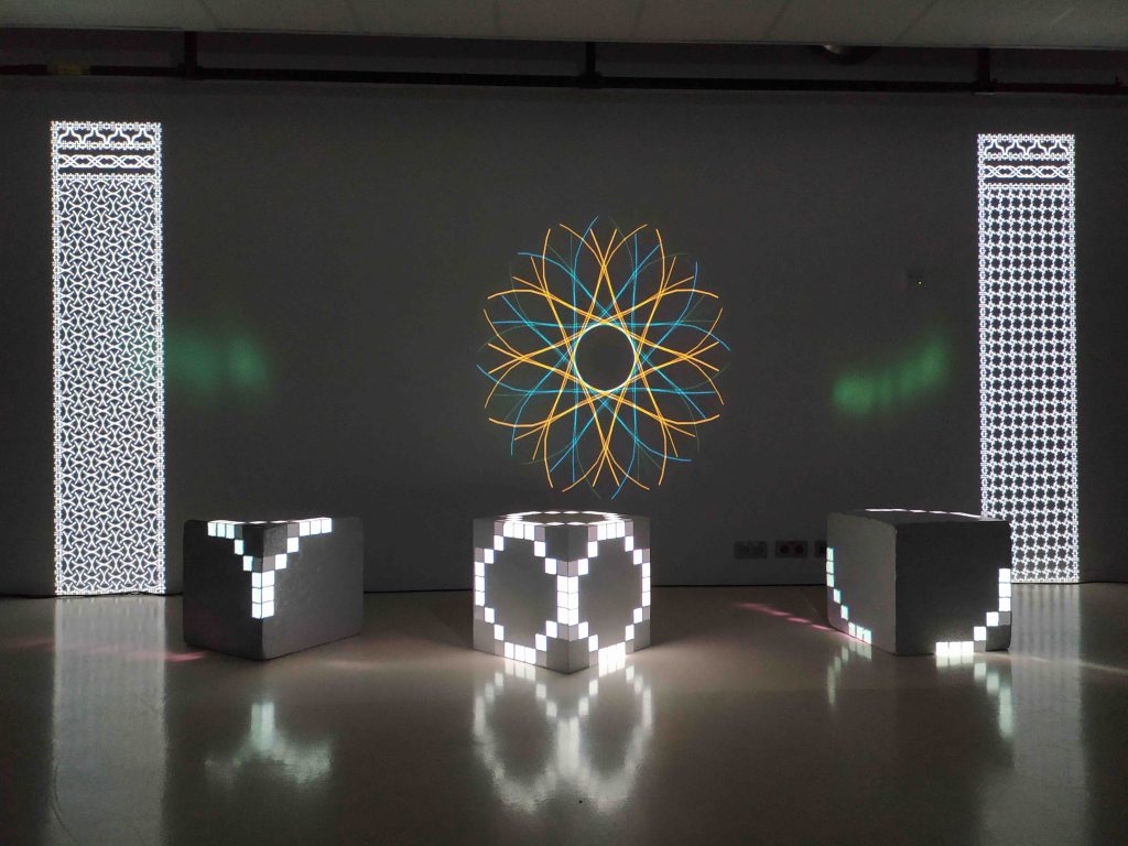 This installation aims to make visible the movement of frequencies by translating the sound into geometric mosaics. This interactive video mapping installation where connected to Sterolux stage mixing box while some groups were rehearsing generating an infinite number of symetric compositions.