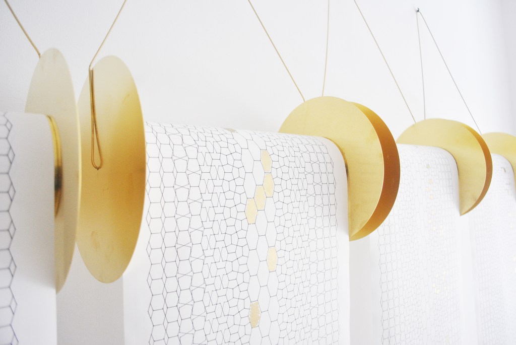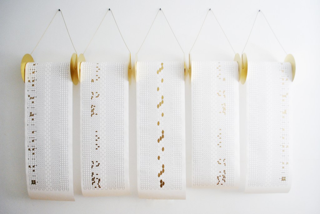 The work is a rhythmic visual composition within a single geometric pattern, chosen as a base and drawn on paper rolls using a felt-tip pen and a plotter. Each instrument’s track is on a separate sheet: the drums in the center; the bass and vocals on the same track to the right and left (in stereo mode); and the guitars at the two extremities.